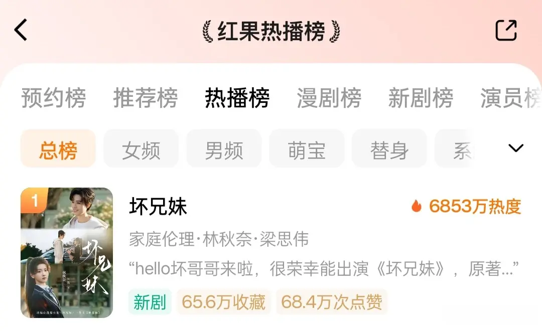 4月17日,由梁思伟、林秋奈主演的《坏兄妹》在红果平台上线。短短24小时,热度狂飙6853万,直接登顶红果热播榜、新剧榜两大榜单TOP1。